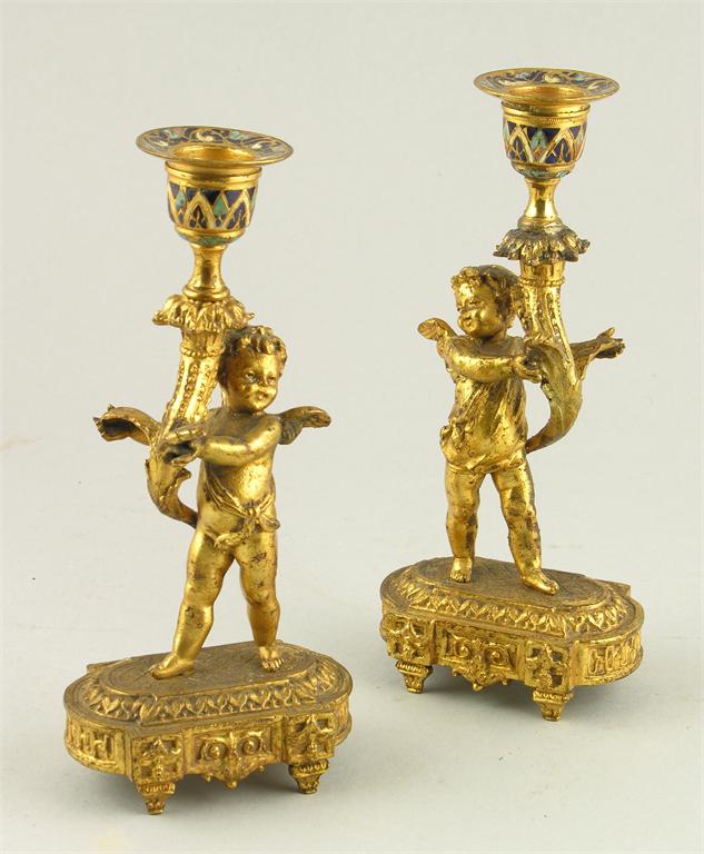 A pair of late 19th century gilt spelter and enamel cherub candlesticks