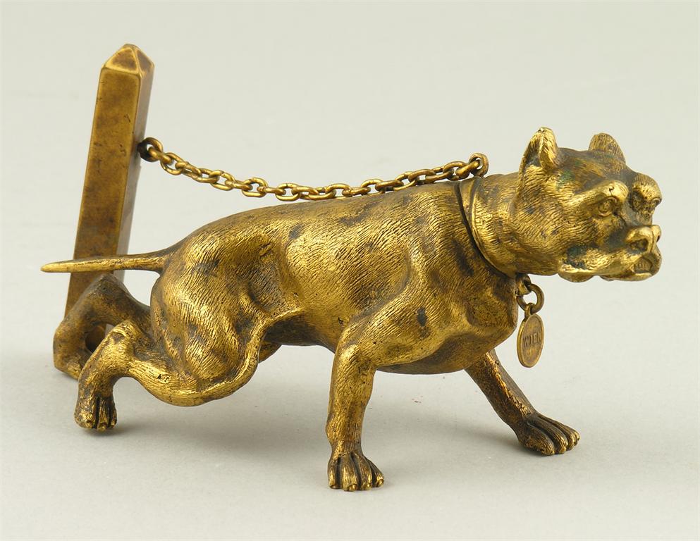 An late 19th century Austrian gilt bronze model of a dog, chained to a stake, the detachable head with a tag stamped 'WIEN', 5.5in (14cm) l.
