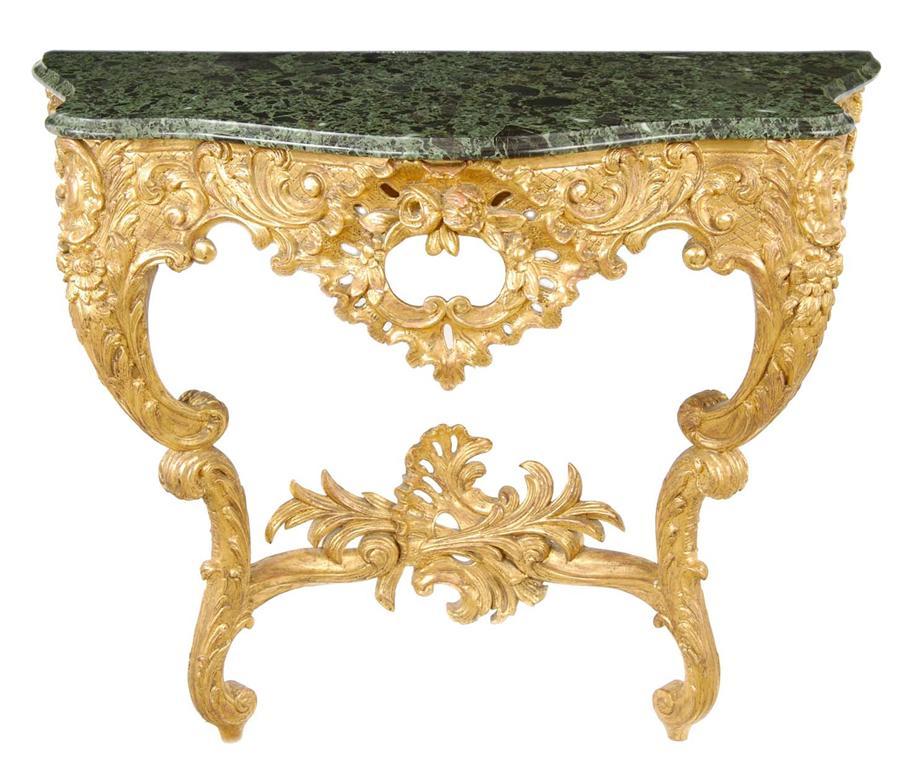 A carved giltwood console table, the verde antico marble top above a leaf and flower carved scrolling base, 19th century but re-gilt, 32.5in (82.6cm) h, 43in (109cm) w, 20.75in (52.5cm) d. Provenance: Tiverton Castle Sale, Bearnes, 1985.