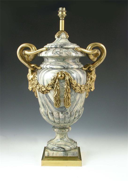 A cipollino marble and gilt bronze mounted vase and cover, with serpent handles and rams' head masks, the base marked 'Thiebaut Freres, Fumiere & Gavignot Scs, Paris', late 19th century, lamped, 20.25in (51.3cm) h, 14in (35.5cm) w.