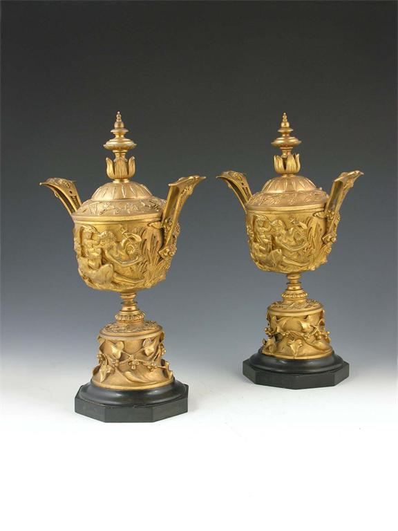 A pair of French gilt bronze vases and covers, each modelled with grape vines, Bacchanalian figures, river gods and bulrushes, on stepped black marble bases, late 19th century, 15.25in (38.6cm) h, 9in (22.5cm) w. (2)