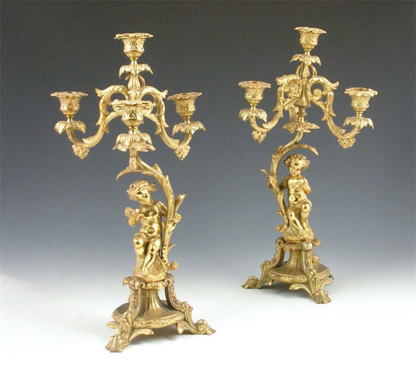 A pair of French gilt spelter four light candelabra, each with a putto supporting the leaf stem, 17in (43cm) h. (2) One foot repaired.