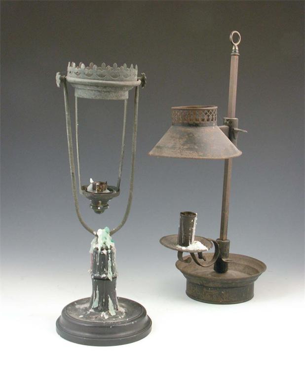 A French tole student's lamp, with a brass ring handle, 19.25in (49cm) h, and another tole lamp. (2)