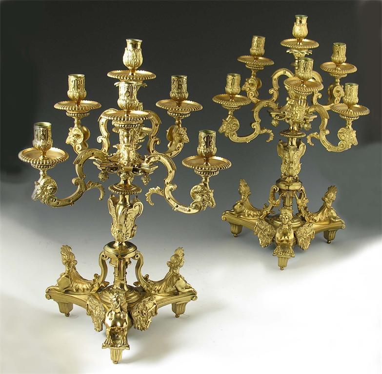 A pair of French ormolu seven light candelabra, after the model by Andre Charles Boulle, raised on three fluted tapering feet, to a triform concave base with masked panels and three sphinx supports, to a turned column above Caesar masks and a ribbed knop, issuing six double 'C' scroll arms on two tiers, with rams' head terminals supporting ribbed drip pans and strapwork decorated holders, the central light holder with stiff leaf decoration, late 19th century 22in (56cm) h, 14in (35.5cm) w. (2)