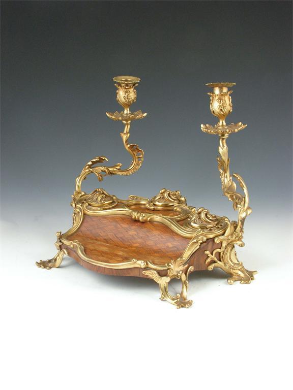 A French kingwood parquetry and ormolu mounted encrier, by Beurdeley, Paris, in Louis XVI style, with a pair of leaf wrapped and rocaille scrolling arms, with petal drip pans and nozzles, the serpentine base with three inkwells each with a hinged lid decorated with scrolling foliage, two liners lacking, the underside of two feet incised 'B Y', late 19th century, 11.75in (29.8cm) h, 14.75in (37.4cm) w, 10in (25.5cm) d.