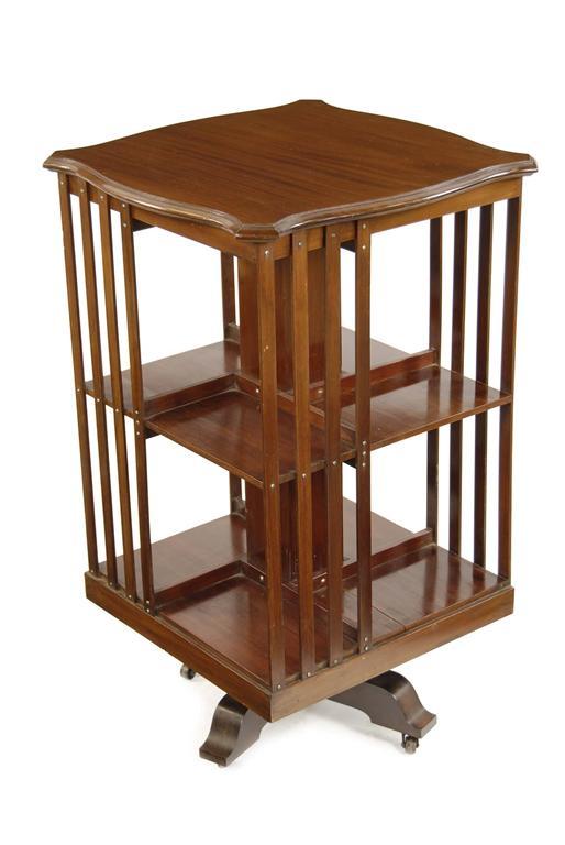 A mahogany revolving bookcase, with a serpentine edge moulded top to slatted sides and castors, early 20th century, 34.25in (87cm) h, 20in (51cm) w and d.