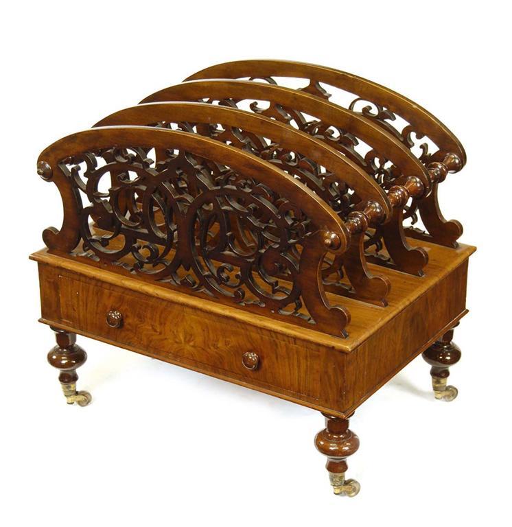 A Victorian walnut canterbury, with four pierced fret work divisions above a frieze drawer, fitted replaced handles and on brass castors, 19.25in (48.8cm) h, 20.75in (52.5cm) w, 14.5in (36.8cm) d. Restoration.