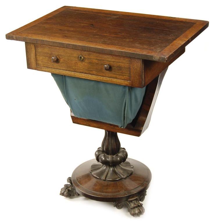 A William IV rosewood work table, the rectangular top crossbanded in amboyna above a frieze drawer and a pull-out bag, to a circular base, hairy paw feet and brass castors, 29.25in (74.3cm) h, 25.75in (65.4cm) w, 17in (43.2cm) d.