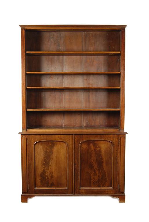 A mahogany bookcase cabinet, the open top section with four adjustable shelves, above a pair of panelled doors enclosing an unusual fitted interior of seventeen drawers and two cupboards removed from an earlier escritoire / cabinet, on bracket feet, 90.75in (230.4cm) h, 54.5in (138.5cm) w, 16in (40.5cm) d.