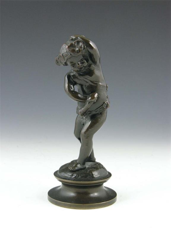 After Claude Michel, called Clodion (1738-1814). A bronze figure of a Bacchic cherub, on a turned socle, the base signed 'Clodion', 19th century, 6.75in (17cm) h, 3in (7.5cm) w.