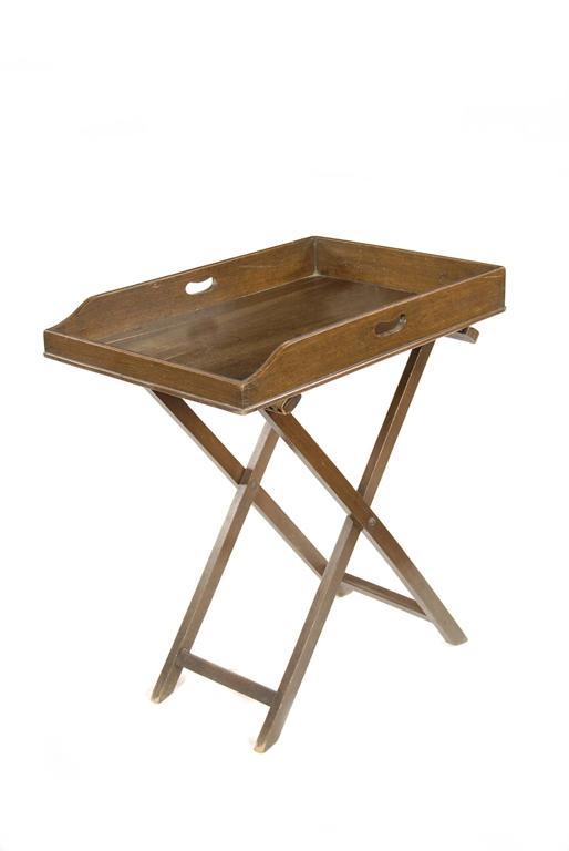 An oak butler's tray, the raised gallery with pierced handgrips, on a folding stand, 31.25in (79.3cm) h, 29.75in (76cm) w, 19.75in (50cm) d. (2)
