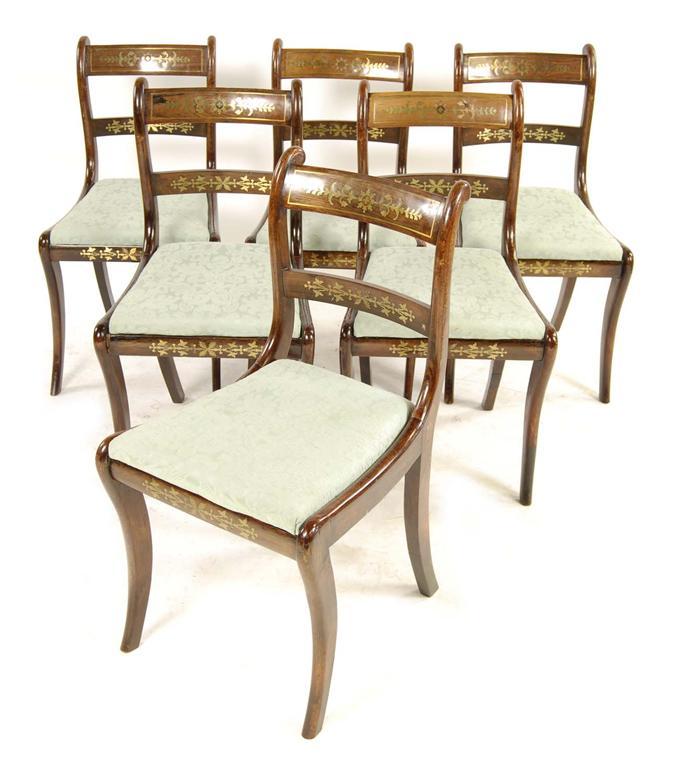 A set of six Regency rosewood, simulated and brass marquetry side chairs, each with a later drop-in seat and on sabre legs. (6) Previously with caned seats.