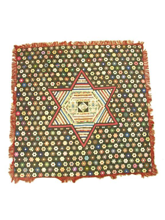 A Victorian Coronation patchwork coverlet, centred a six point star with two silkwork panels depicting Queen Victoria's profile bust within a crowned garter, bordered by roses, thistles and shamrocks, with motto HONY SOIT QUI MAL Y PENSE, to a black ground field with stylized florets, with a black and red tassel border, 94in (239cm) square.