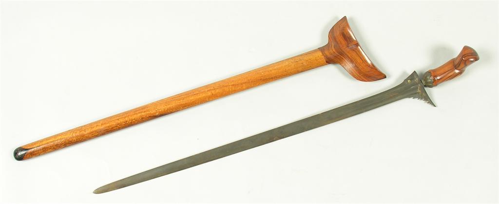 A Malayan kris, the 22in (56cm) blade with a shaped rosewood handle, in a sheath.
