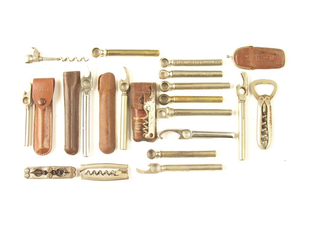 Thirteen picnic corkscrews; seven advertising; three cased; a German collapsing pocket corkscrew, marked; three folding pocket corkscrews and a part corkscrew. (18)