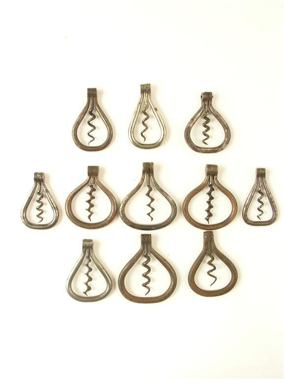 Eleven folding bow corkscrews; one with faceted bow and grooved helix. (11)