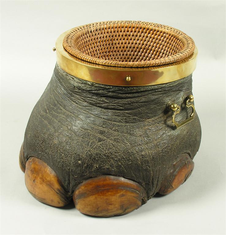 An elephant foot waste paper basket, the zinc lined interior with a wicker basket, to a brass rim and a pair of carrying handles, one toe inscribed '2533', 11.5in (29.2cm) h, 12.25in (31cm) dia.