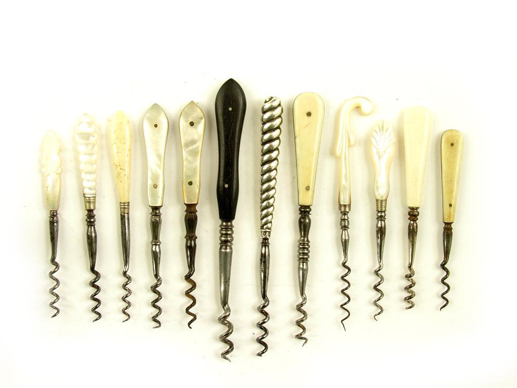 Twelve perfume bottle steel corkscrews; six with mother of pearl handles; four ivory or bone; one...