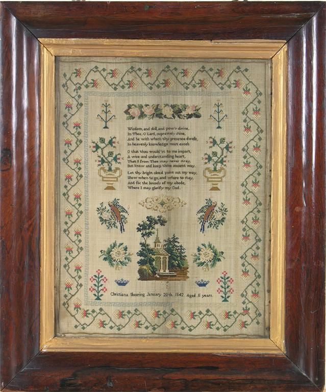A Victorian sampler, by 'Christiana Sheering, January 20th 1842, Aged 11', worked verse, flowers and temple to a strawberry border, 16 x 12.5in (40.5 x 31.7cm) in a rosewood frame.