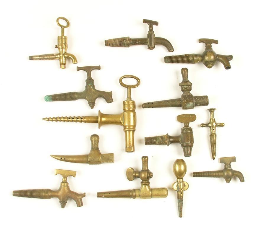 Eleven taps, including; a brass example with key and archimedean screw, marked F.S.; another brass with key, Farrow & Jackson; one plain by Gaskell; eight other taps and two brass air vents. (13)