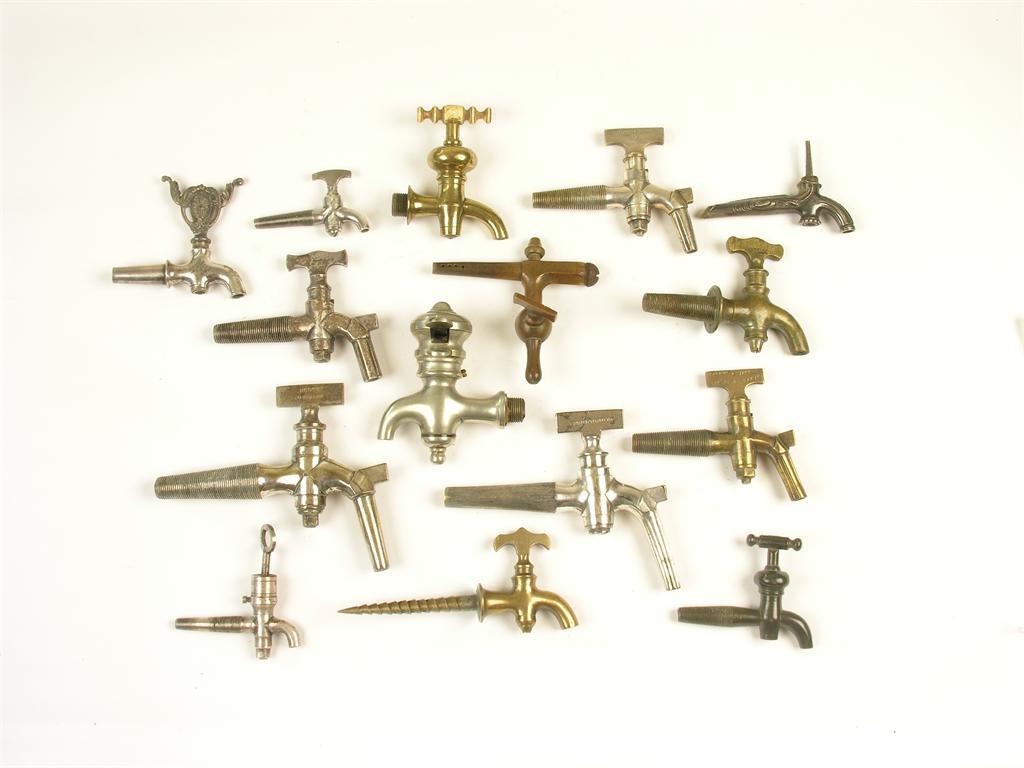 Fifteen taps, including; a silver coloured metal example with leaf chased decoration; one plated with a pierced cartouche and leaf handle; five brass, marked Farrow & Jackson, Fiddian, A T Lee & Co, Loftus, unmarked with ivory handle; four plated by Farrow & Jackson; another by Lumley, plating worn; another marked MASONOID SILVER; one bronze and another. (15)