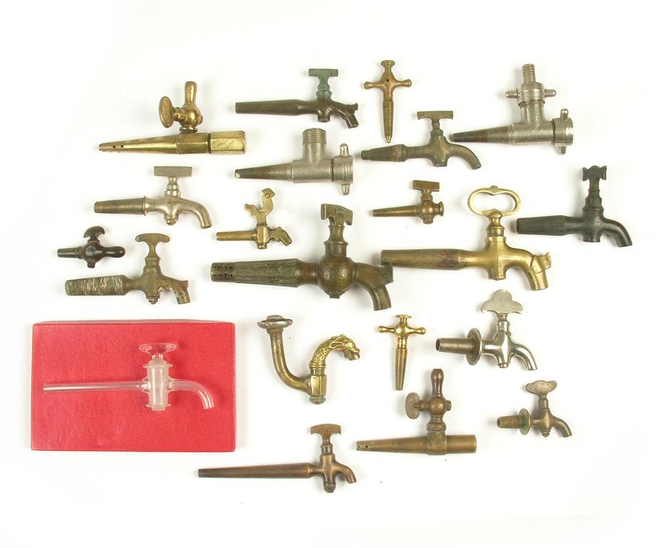 Sixteen taps, including; eight brass, one glass; one with a bird handle, another as a dolphin spout; two plated, one by Farrow & Jackson; one bois ducri, three others, two air vents and two valves. (21)