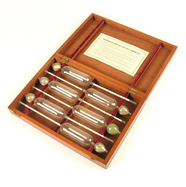 A cased set of six glass Sikes hydrometers, by Thomas Armstrong & Brother Limited, Manchester.