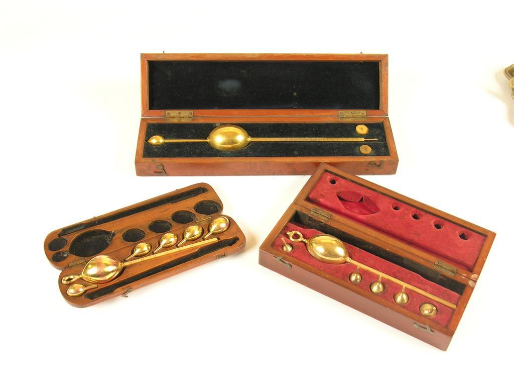 A brass Bates Saccharometer, by Griffin & Tatlock Ltd, London, in fitted mahogany case; another marked L. OERTLING LTD LONDON E.C., the mahogany case marked a crown above 1981 ER, both thermometers missing; a brass hydrometer marked John B. Everall, LONDON No.149, in a fitted case. (3)