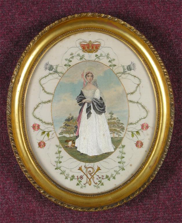 A Victoria Coronation commemorative oval silkwork and painted panel