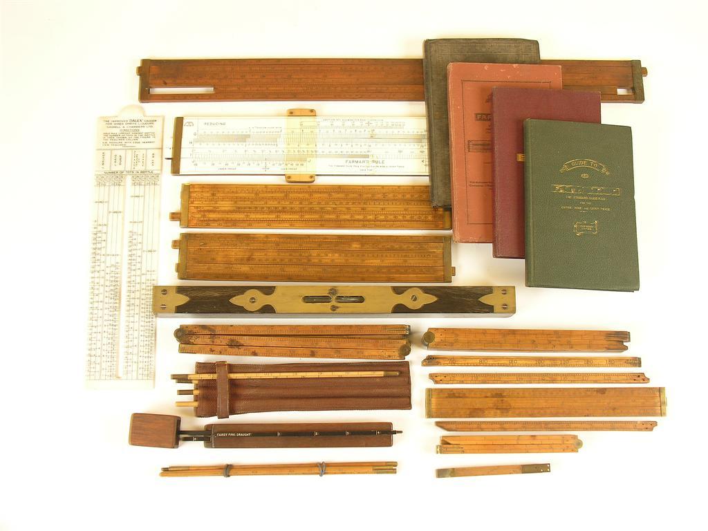 A Dring & Fage boxwood slide rule; a proof slide rule by Loftus; another by J Long; a plastic covered Farmer's rule (Deck Size); two four fold rods by J Long; a Dalex gauger; a Page & Pratt four part rod in canvas holder; other measuring instrument with parts missing.