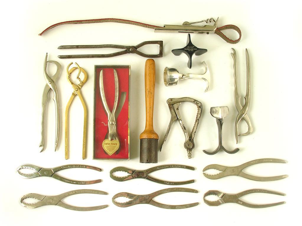 Six champagne cork grippers; all advertising; two German grippers; a boxed New Pince; a KASNETT lever gripper; a Mater Eze Opener; a steel scissor type grip marked JB; a modern German type; a gripper with turned wood handle marked BROADBENT'S PATENT 2370/09; two finger pull grippers; a Screwpull Champagne Star. (17)