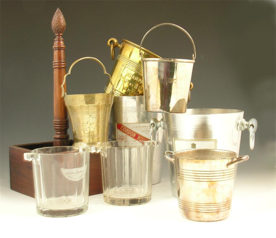 A brass champagne bucket, marked CHAMPAGNE VVE PAUL BUR & CIE REIMS, two alumunium buckets, an Elkington Plate White Star Line bucket, engraved the trade mark flag, two other plated buckets, one worn, two glass buckets and a modern hardwood four bottle carrier. (9)