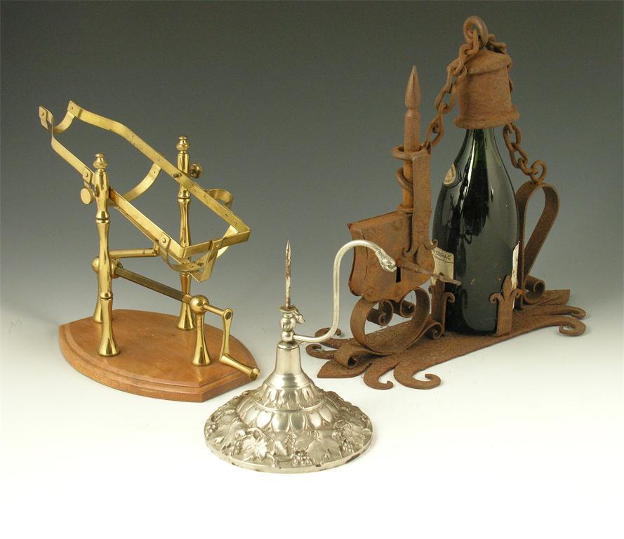 A modern brass bottle cradle, with tilt mechanism; an iron bottle lock, with key; a cast iron tap stand, with serpent spout, the underside marked J.G. (3)