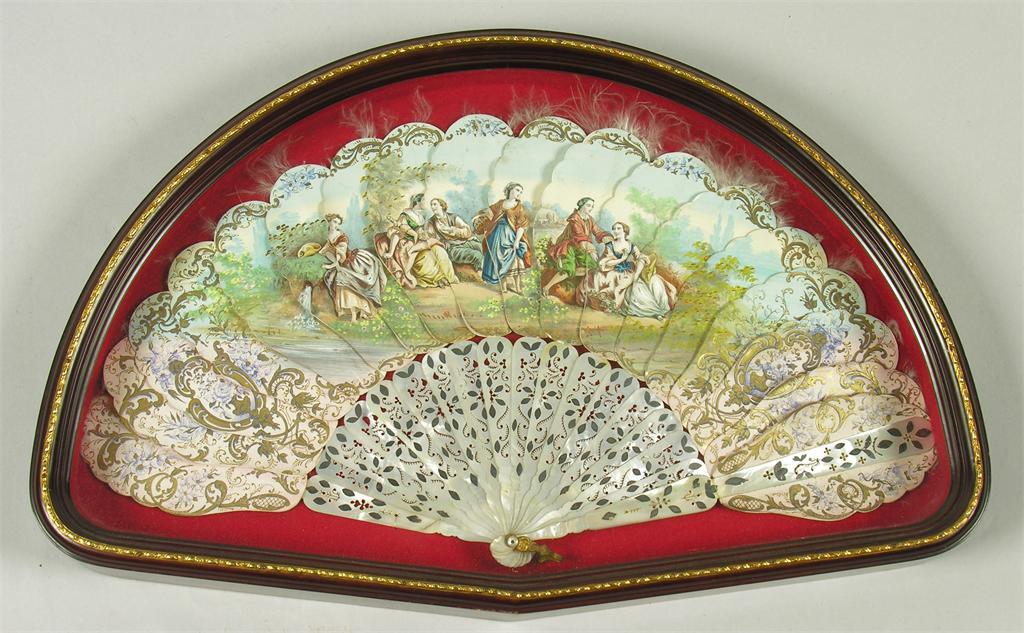 A French painted lithograph fan, with gilt highlights and pierced mother of pearl sticks, cased, 13.5 x 21in (34 x 53.2cm).