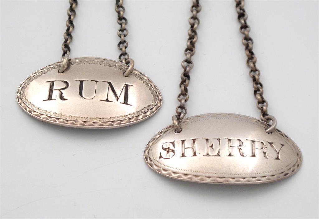 oval eye form, bright-cut borders, incised 'RUM', length 4.1cm, plus a George silver wine label, by James Hyde, circa 1790, eye form, bright-cut borders, re-titled 'SHERRY', length 4.4cm. (2)