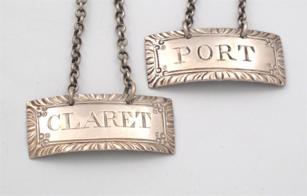 A pair of George III silver wine labels, by Thomas Hyde, London circa 1780, rectangular form, feather-edge borders, incised 'CLARET' and 'PORT', length 4.3cm. (2) Provenance: purchased from Apollo Antiques, 30th July 1977.