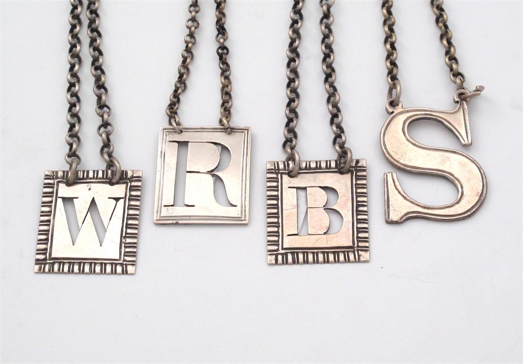 rectangular form, gadroon borders, with cut-out letters 'W' and 'B', height 2.6cm, plus another cut-out letter wine label of similar form, reeded borders, with the letter 'R', London 1798, by Phipps and Robinson, and a Victorian silver cut out label 'S', by Rawlins and Summers, London 1847, height 3.2cm. (4)
