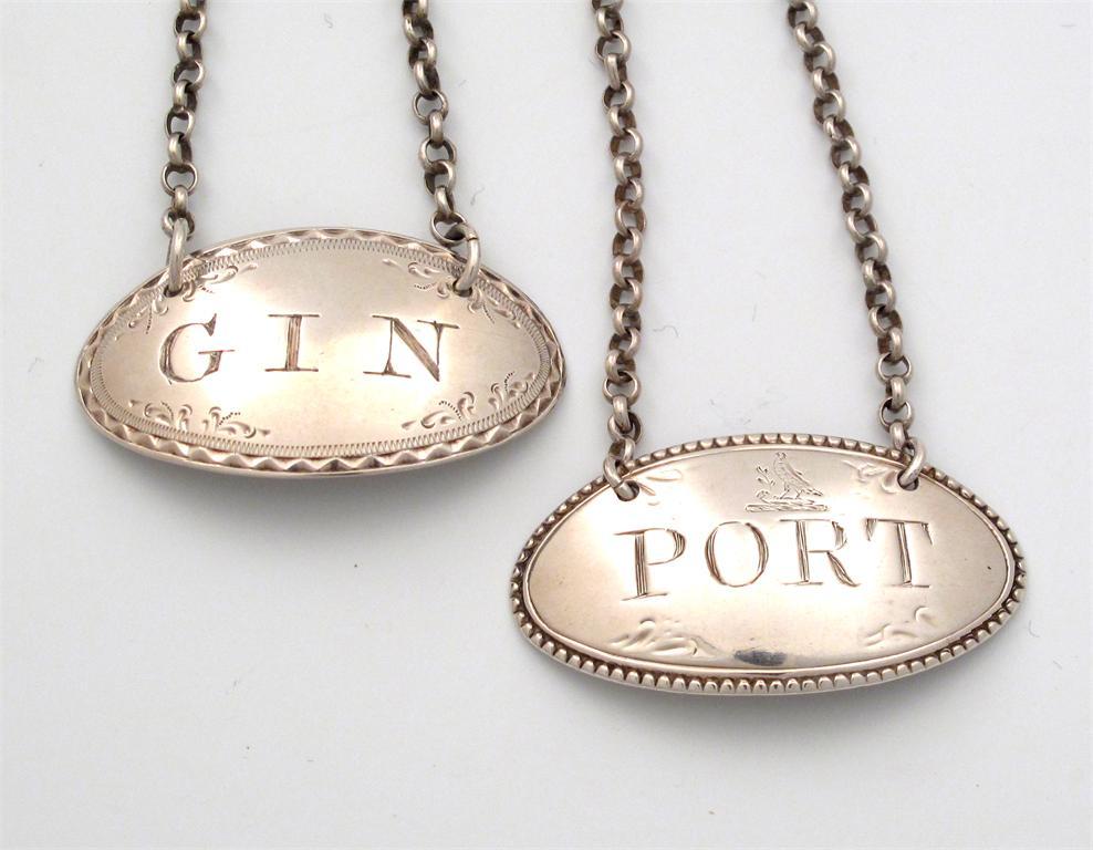 oval eye form, beaded border, engraved with a crest and incised 'PORT', length 4.4cm, plus a George III silver wine label, by James Hyde, circa 1790, eye form, bright-cut border, incised 'GIN', length 4.2cm. (2)