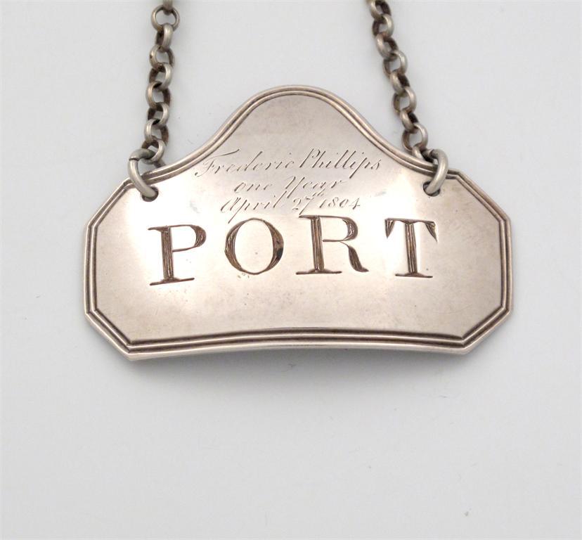 rectangular form with a raised pediment, reeded border, incised 'PORT', and engraved 'Frederick Phillips, one year, april 27 1804', length 4.7cm.