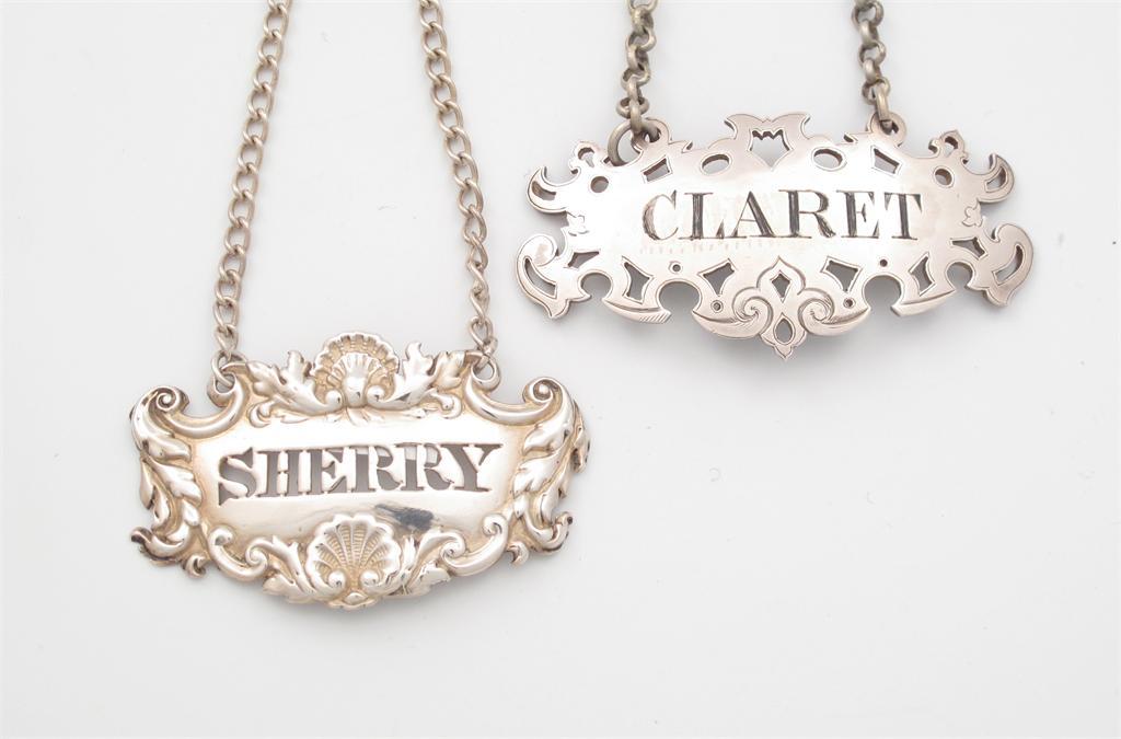 pierced and shaped oval form, incised 'CLARET', length 6cm, plus a George IV silver wine label, by Reily and Storer, London 1829, cartouche form, foliate scroll and shell borders, pierced 'SHERRY', length 5.2cm. (2)