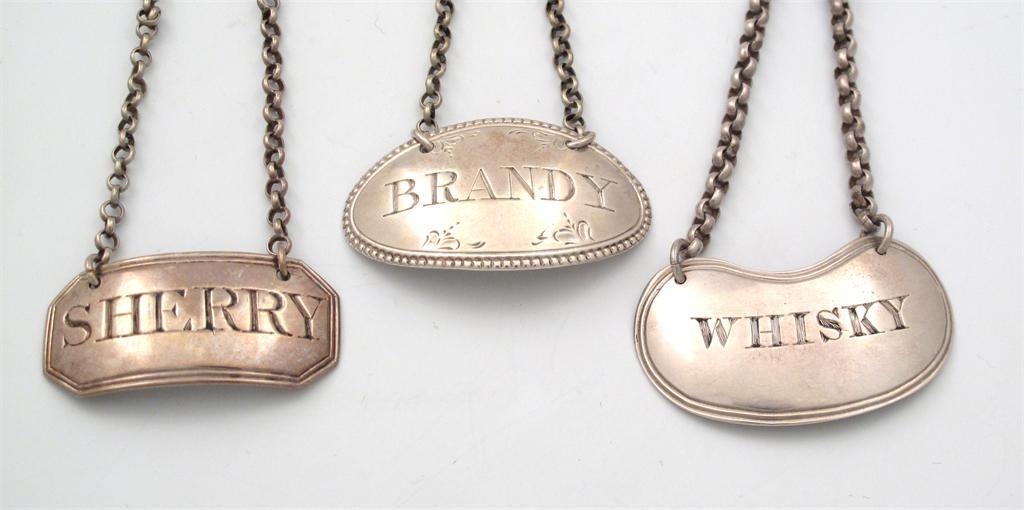 comprising: a George III label, by Phipps and Robinson, circa 1790, oval eye form, beaded border, engraved decoration, incised 'BRANDY', length 4.3cm, plus a George IV label, by Joseph Willmore, Birmingham 1824, kidney form, reeded border, incised 'WHISKY', length 4.4cm, and a George III silver label, by John Rich, London 1791, rectangular form, canted corners, reeded border, incised 'SHERRY', length 4cm. (3)