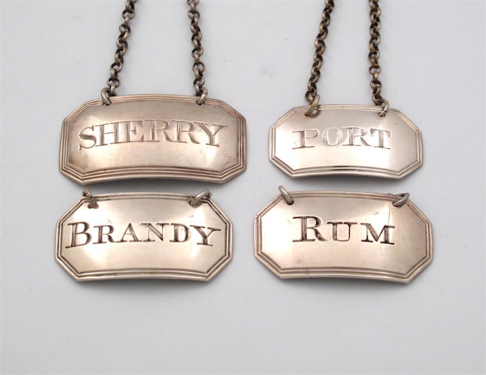rectangular form, canted corners, reeded borders, all incised, comprising, a pair of labels, 'RUM' and 'BRANDY' by Phipps and Robinson, London 1797, length 4.1cm, 'SHERRY' by Susannah Barker, London 1792, length 4.5cm, and 'BRANDY', by Phipps and Robinson, London 1797, and 'PORT', by Mary Hyde and John Reily, London 1800, length 3.7cm. (4)