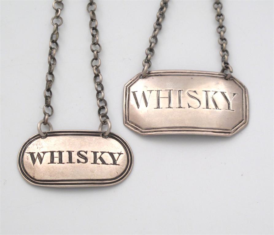 rectangular form, canted corners, reeded borders, incised 'WHISKY', length 3.8cm, plus a George IV Scottish silver wine label, by George McHattie, Edinburgh circa 1820, of oblong form, reeded borders, incised 'WHISKY', length 3.3cm. (2)