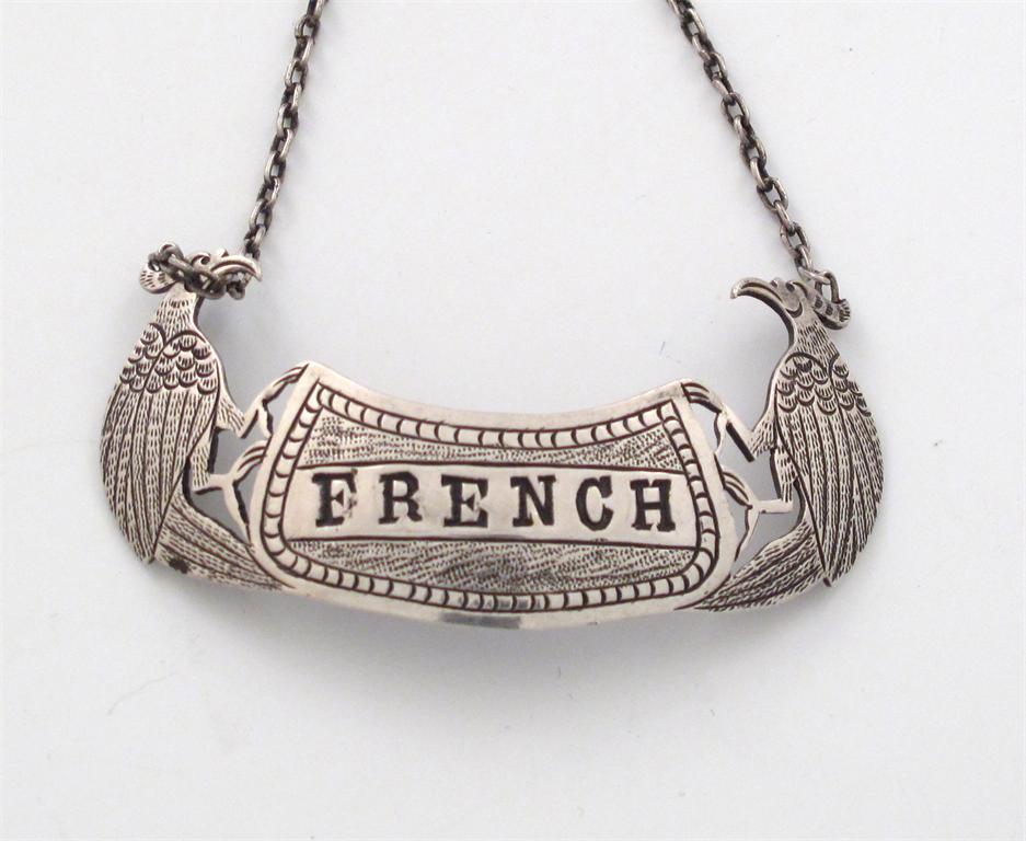 A colonial wine label, unmarked, shaped form, each end mounted with a tropical bird, engraved 'FRENCH', length 6cm.