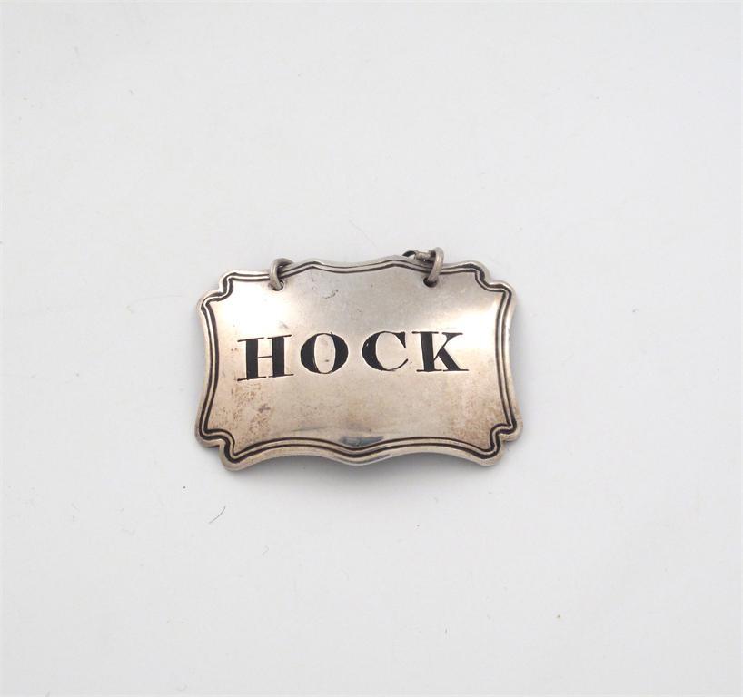 A George IV silver wine label, by Charles Rawlings, London 1828, shaped rectangular form, reeded border, incised and blackened 'HOCK' , length 4.7cm.