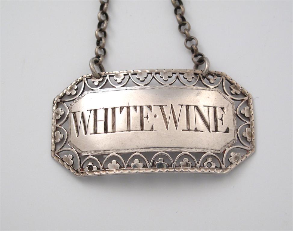 A George III silver wine label, by Phipps and Robinson, London 1791, rectangular form, canted corners, with a pierced foliate border and bright-cut decoration, incised 'WHITE WINE', length 4.7cm.