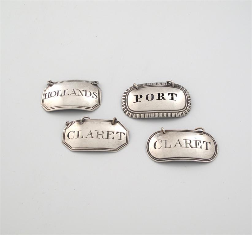 A small collection of four silver wine labels, comprising: one of oblong form, pierced 'PORT', gadroon border, plus one incised 'HOLLANDS', by Joseph Willmore, Birmingham 1808, plus two labels incised 'CLARET'. (4)