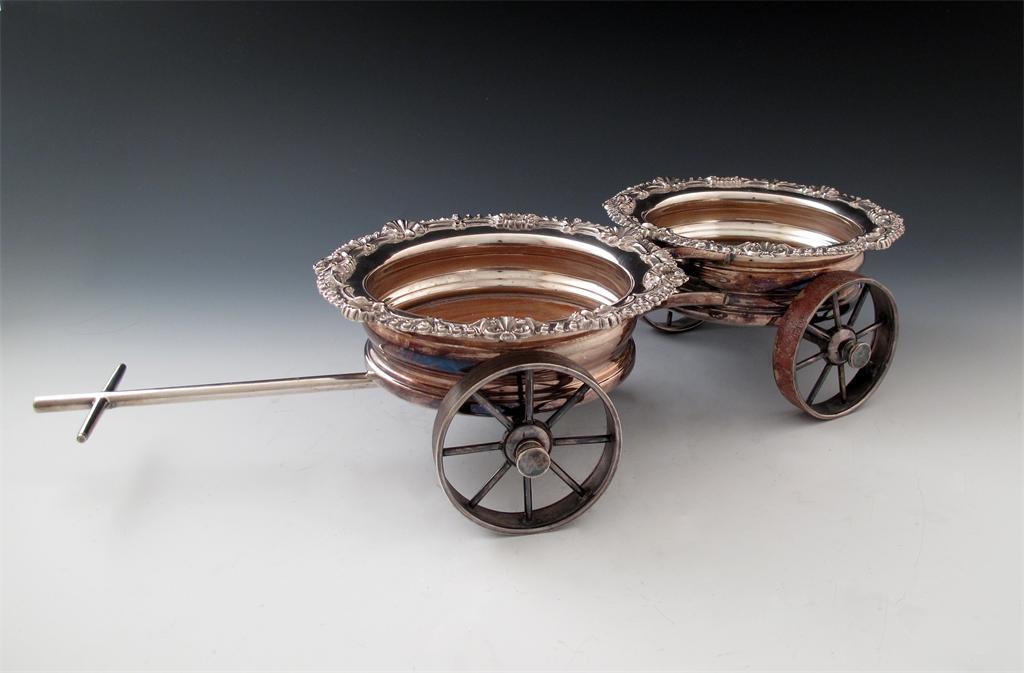 An electroplated decanter trolley, double circular coaster form, shell and scroll borders, central plain button, on four wheels, with a pulling handle, length 48.5cm.