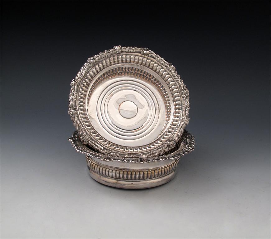 A pair of old Sheffield plated wine coasters, unmarked circa 1820, circular form, part-fluted decoration, gadroon and foliate shell borders, diameter 18cm. (2)