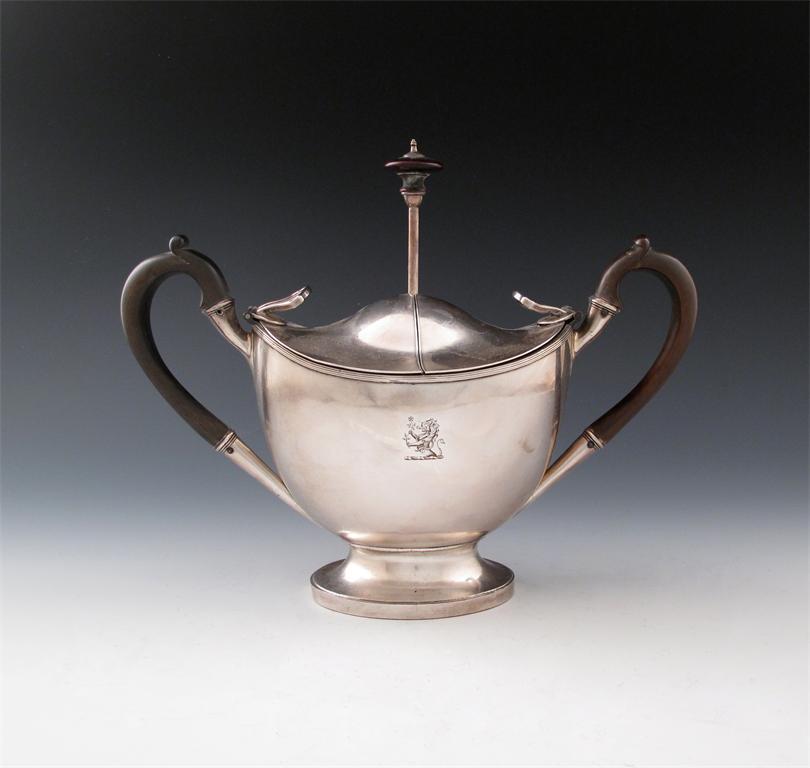 oval form, scroll side handles, the double hinged domed cover opens to reveal a pull-out wirework four egg frame, on a raised oval foot, length handle to handle 16.8cm.